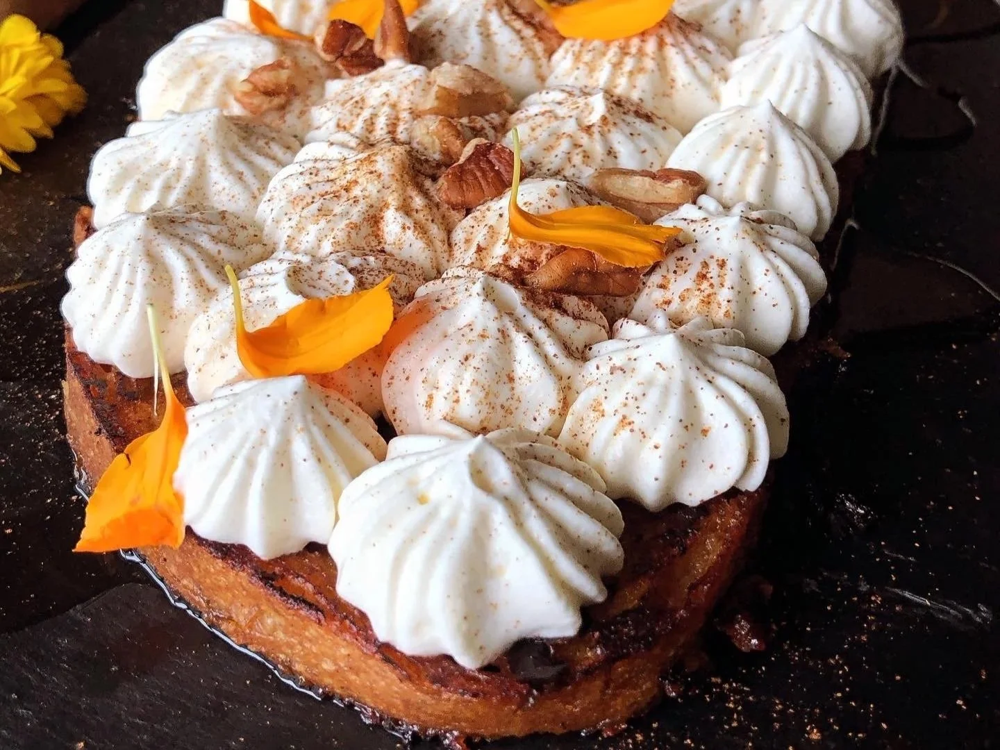 Remove from pan and ad to a plate. Add a sprinkle of maple syrup on each slice, followed by whipped cream piping, toasted pecans, and for the final touch sprinkle cinnamon, more maple syrup and edible flower petals.